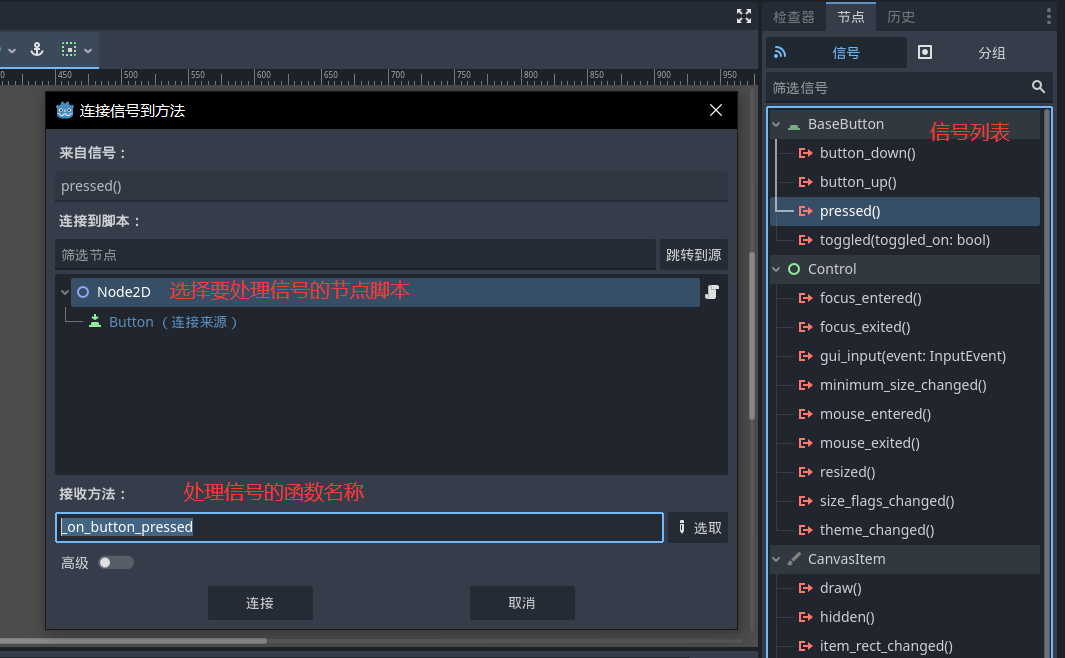 在编辑器中,则可以选择一个带有信号的节点,在界面右侧检查旁找到节点面板,选择信号面板,双击想要连接的信号,然后在弹出的连接信号面板中选择一个处理信号的脚本,并选取或新建一个处理方法。点击连接按钮后即可将信号连接到方法。