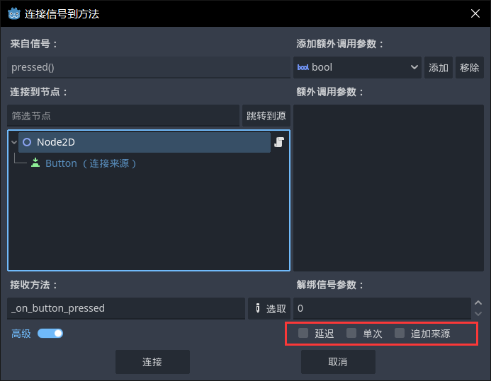 部分信号标志可以在Godot编辑器的信号连接窗口中选择(需要勾选高级按钮):